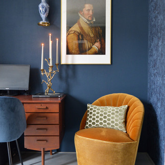 De prachtige warme gele outfit van de man kleurt prachtig met de fauteuil eronder en geeft een mooi accent op de donkerblauwe muur. En de afkomst van de schilder geeft een mooie knipoog naar onze geliefde woonplaats.